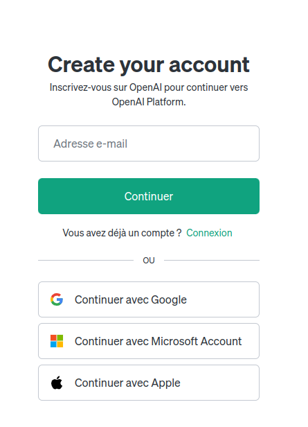 Si vous n'avez pas de compte OPENAI, créez en un en vous rendant sur https://openai.com/