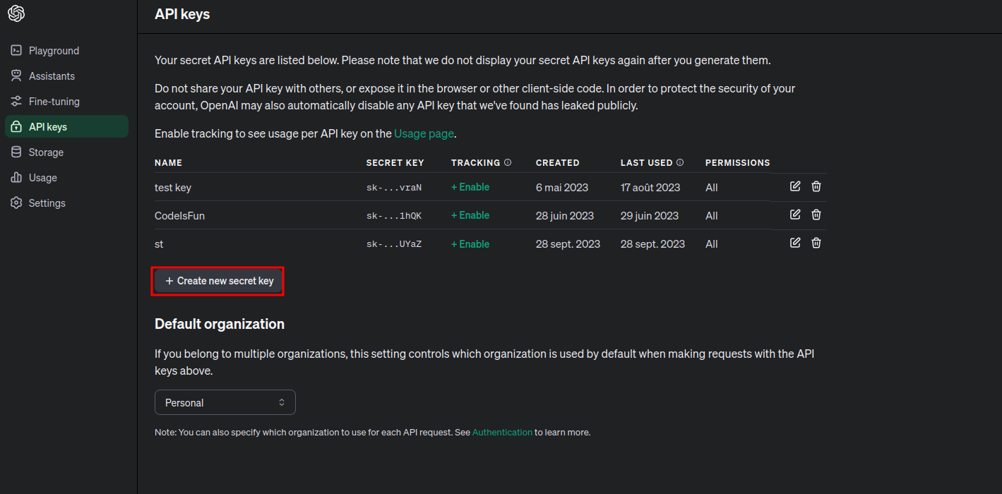 Cliquez sur "Create new secret key". J'ai nommé la mienne open interpreter.