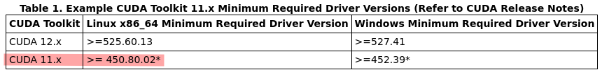 Après être allé m'instruire sur la documentation de CUDA, le driver qui nous intéresse est le 470. Avec l'expérience, j'ai appris qu'il ne fallait jamais prendre les dernières versions, elles ne sont pas assez robustes et il y a toujours des problèmes de compatibilités avec tensorflow et pytorch. Mieux vaut prendre une version légèrement plus ancienne. Nous allons prendre la version de cuda 11.4 dans ce tutorial par conséquent, nous voyons qu'il nous faut un driver nvidia supérieur ou égale à la version 450. J'opterais donc ici pour la 470.