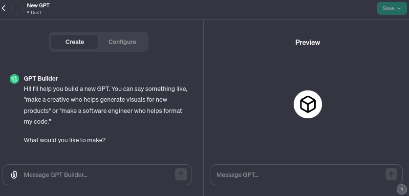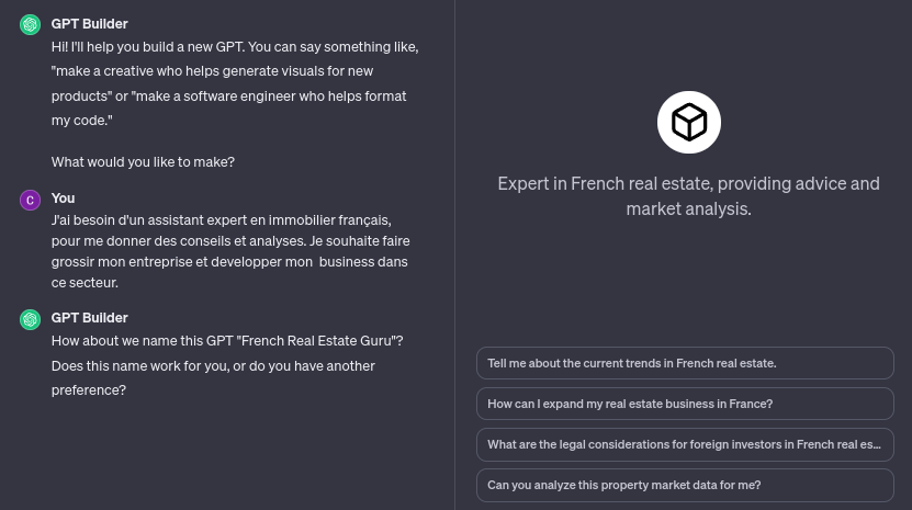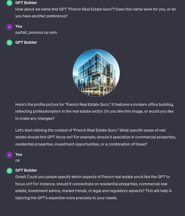 Création d'un GPT de Zéro avec le GPT Builder: cet outil interactif commence par poser des questions simples pour comprendre vos besoins. En fonction de vos réponses, il génère un prototype de GPT que vous pouvez ensuite affiner.