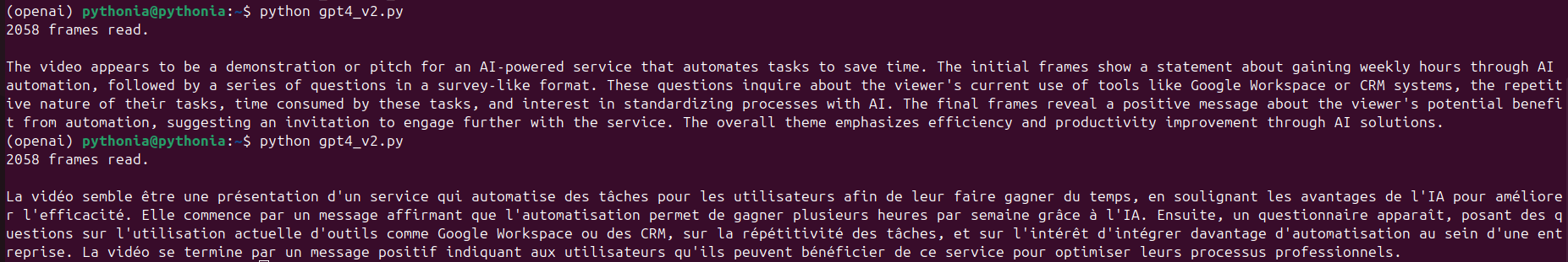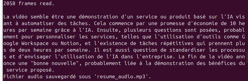 GPT-4 fournira une description textuelle de chaque image. Vous pouvez stocker ces réponses, générer un résumé global, ou créer des métadonnées associées à chaque moment clé.