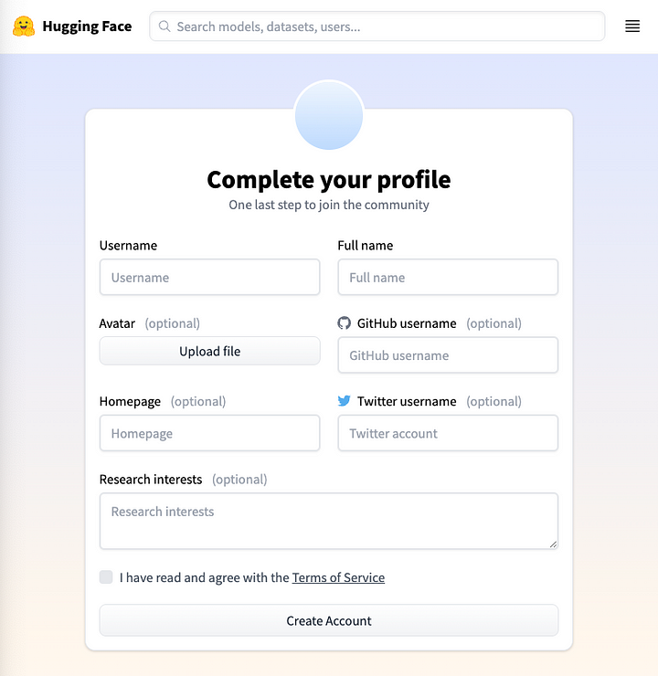 Tout d'abord, creez un compte sur Hugging Face: https://huggingface.co/
